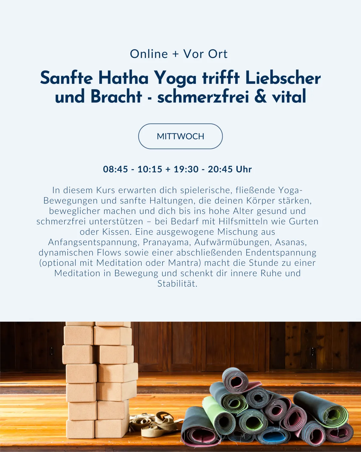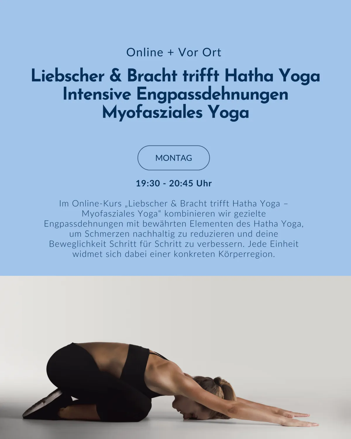 Der Liebscher-&-Bracht-Ansatz arbeitet mit sogenannten Engpassdehnungen und Faszientechniken, die fehlende Bewegungswinkel im Körper wiederherstellen. Im therapeutischen Yoga verbinden wir diese gezielte Schmerzreduktion mit klassischem Hatha Yoga, Atemtechniken und Entspannungsübungen.