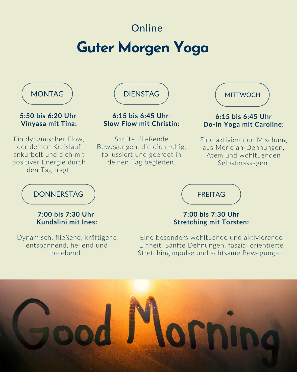 "Guten Morgen Yoga ist eine schöne Routine für mich geworden und es ist ein absoluter Gewinn - mein Start in den Tag ist damit gesichert! Ich bin selbst Yogalehrerin und ich weiß wie wichtig es ist entspannt in den Tag zu starten" - Silke