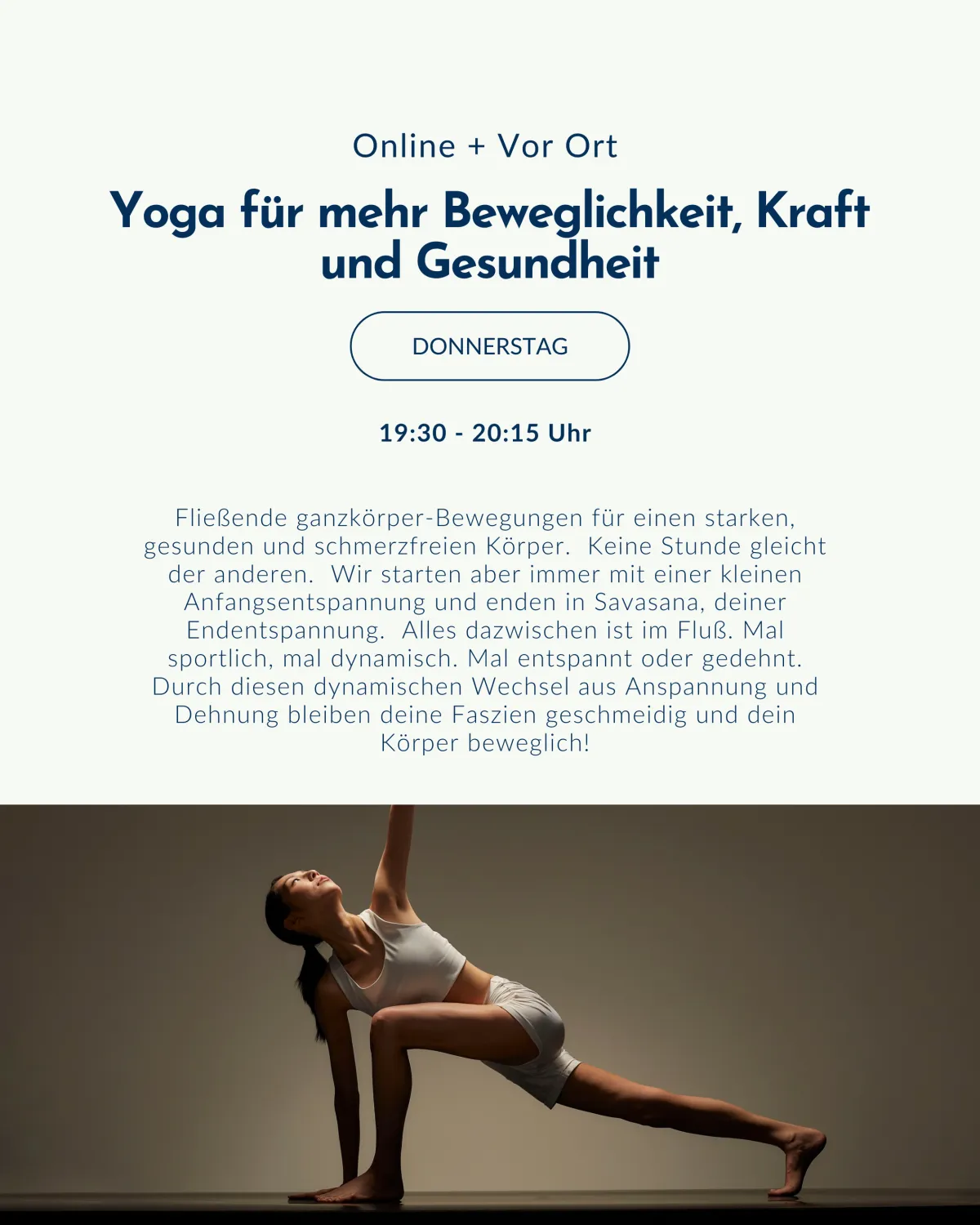 Viele Menschen glauben, sie müssten mit Schmerzen leben – doch in den meisten Fällen steckt keine „kaputte Struktur“ dahinter, sondern zu hohe Spannung in Muskeln und Faszien. Genau hier setzt Yoga an. Durch sanfte, gezielte Dehnungen, kräftigende Übungen und bewusstes Atmen lösen sich diese überhöhten Spannungen Schritt für Schritt. Der Körper findet zurück in seine natürliche Beweglichkeit, der Schmerz lässt nach, und viele spüren schon nach kurzer Zeit mehr Freiheit im Alltag. Yoga hilft nicht nur dem Körper – der Geist wird ruhiger, Stress reduziert sich und das Nervensystem lernt, Schmerzen anders einzuordnen. Diese Kombination ist der Grund, warum Yoga bei Rücken-, Hüft-, Schulter- oder Nackenschmerzen so wirkungsvoll ist.