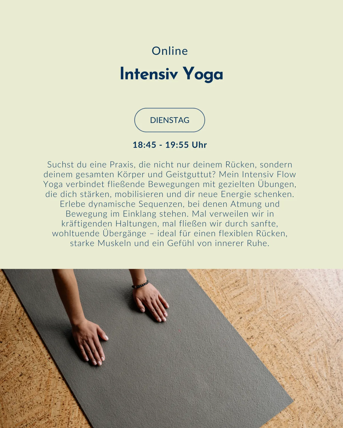 "Schmerzen sind nach 90-minütiger Yogastunde weg und ich bin auch ganz hin und weg von der psychischen Erholung. Durch die Atemmeditation und Endentspannung habe ich wieder zu meiner Mitte gefunden. Online genau gleich wohltuend wie vor Ort!" - Irma